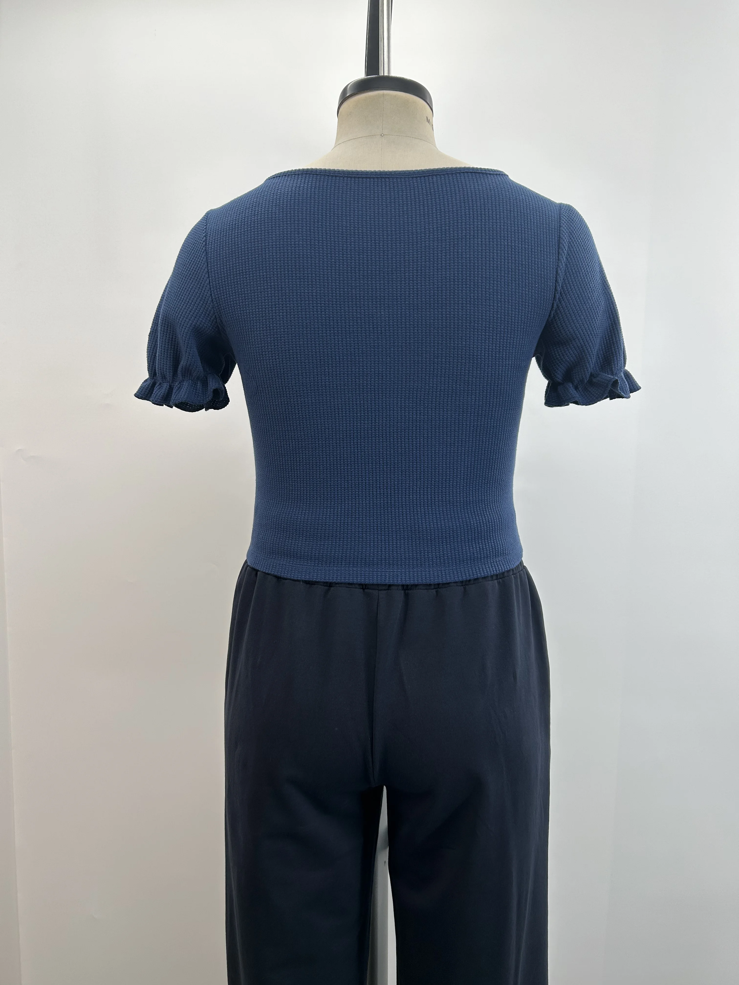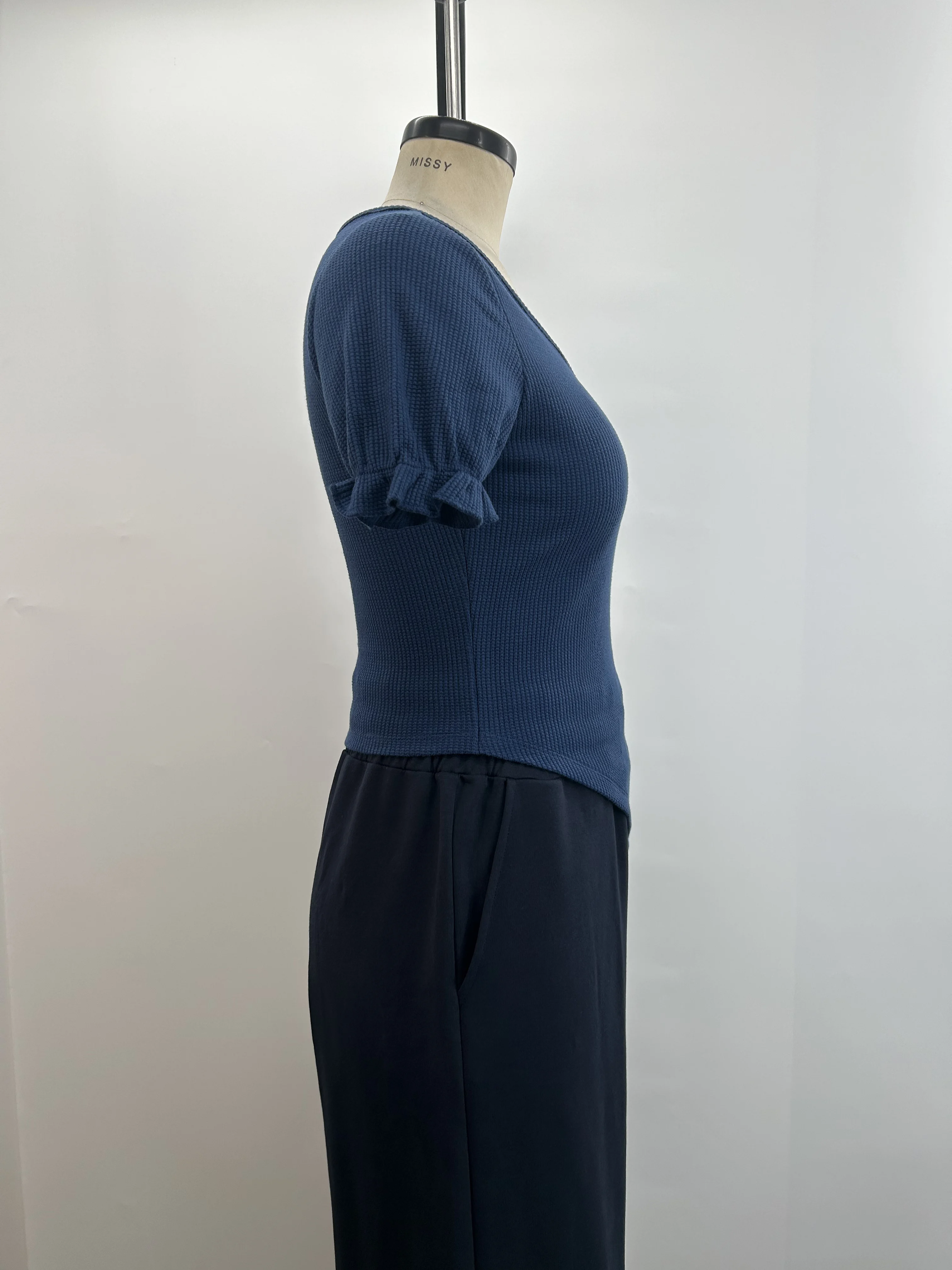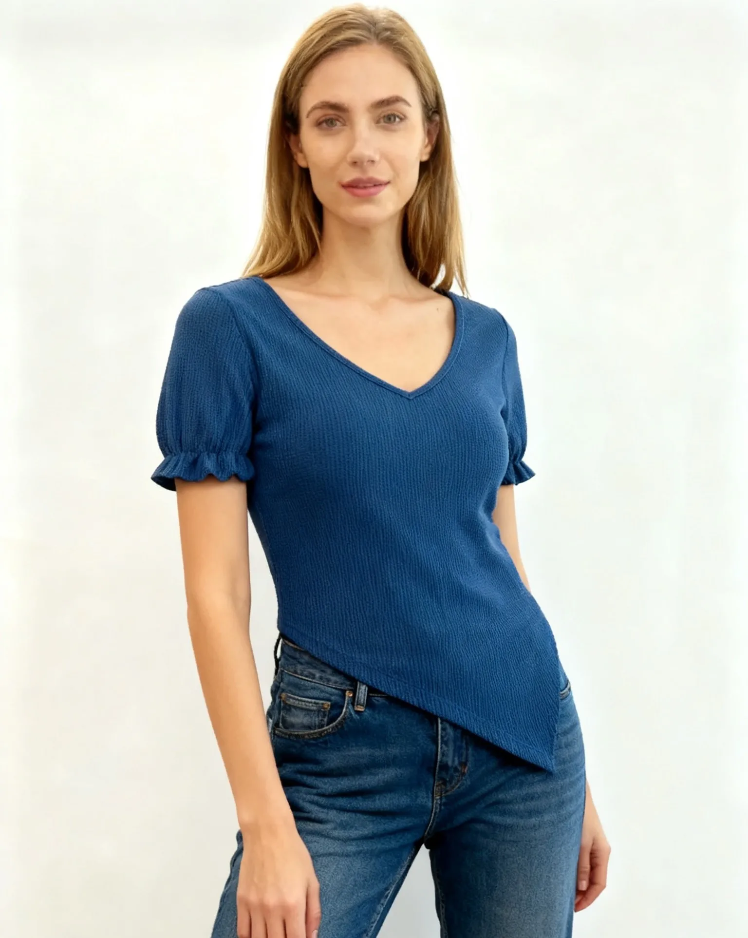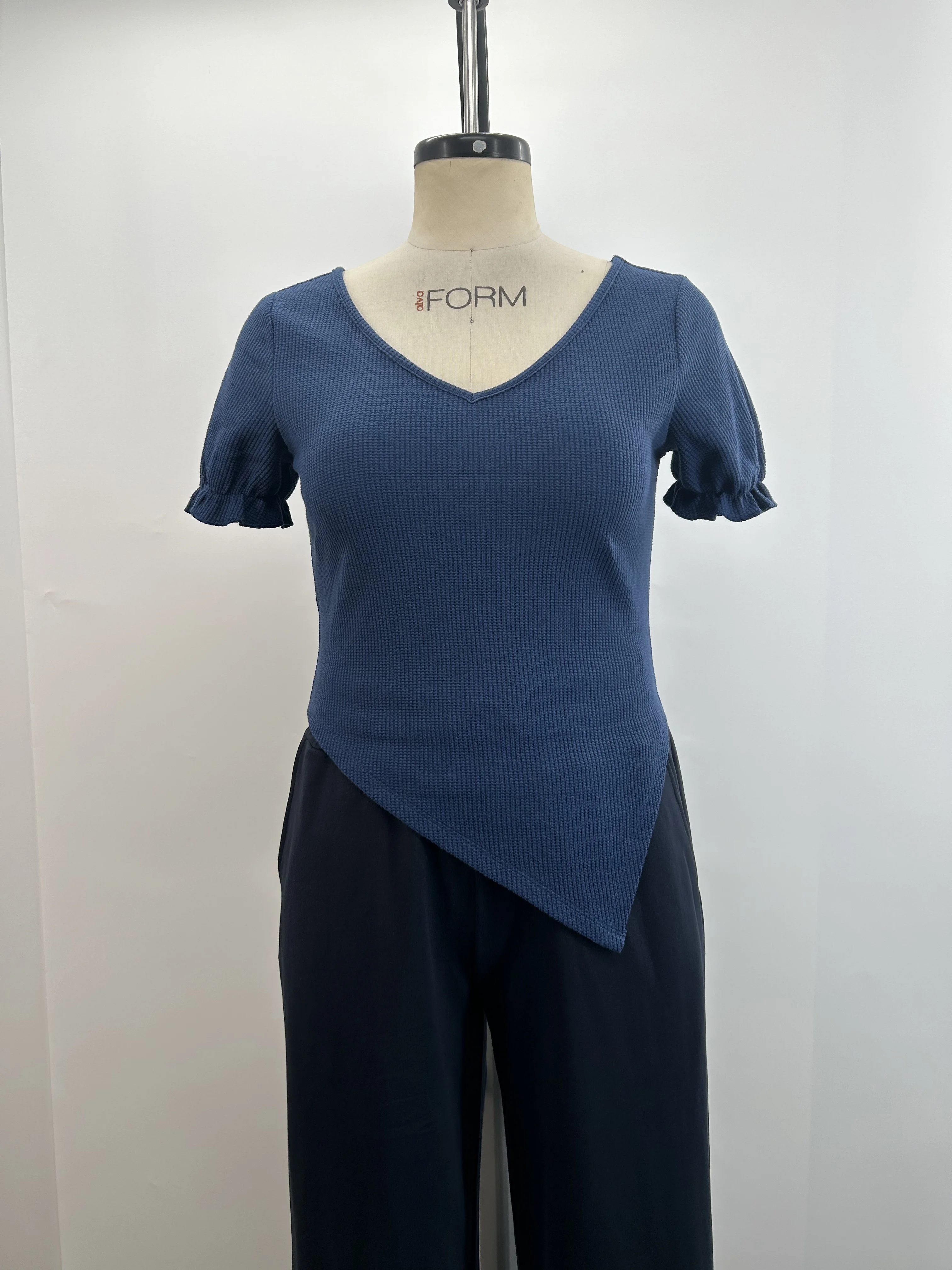 Women's Fashion Slim Fit Blue Blouse with Asymmetrical Hem V-Neck and Short Ruffle Sleeves Solid Waffle Knit Crop Top
